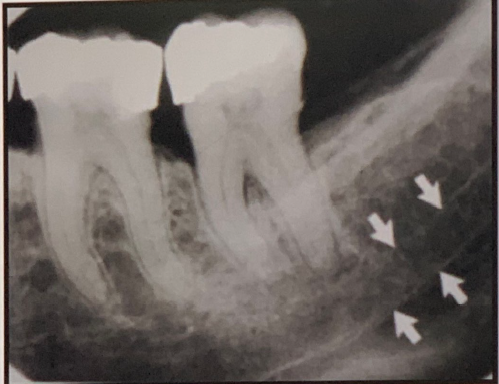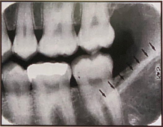 Inferior Alveolar Canal appears as a dark linear shadow with thin radiopaque superior and inferior borders cast by the lamella of bone that bounds the canal.