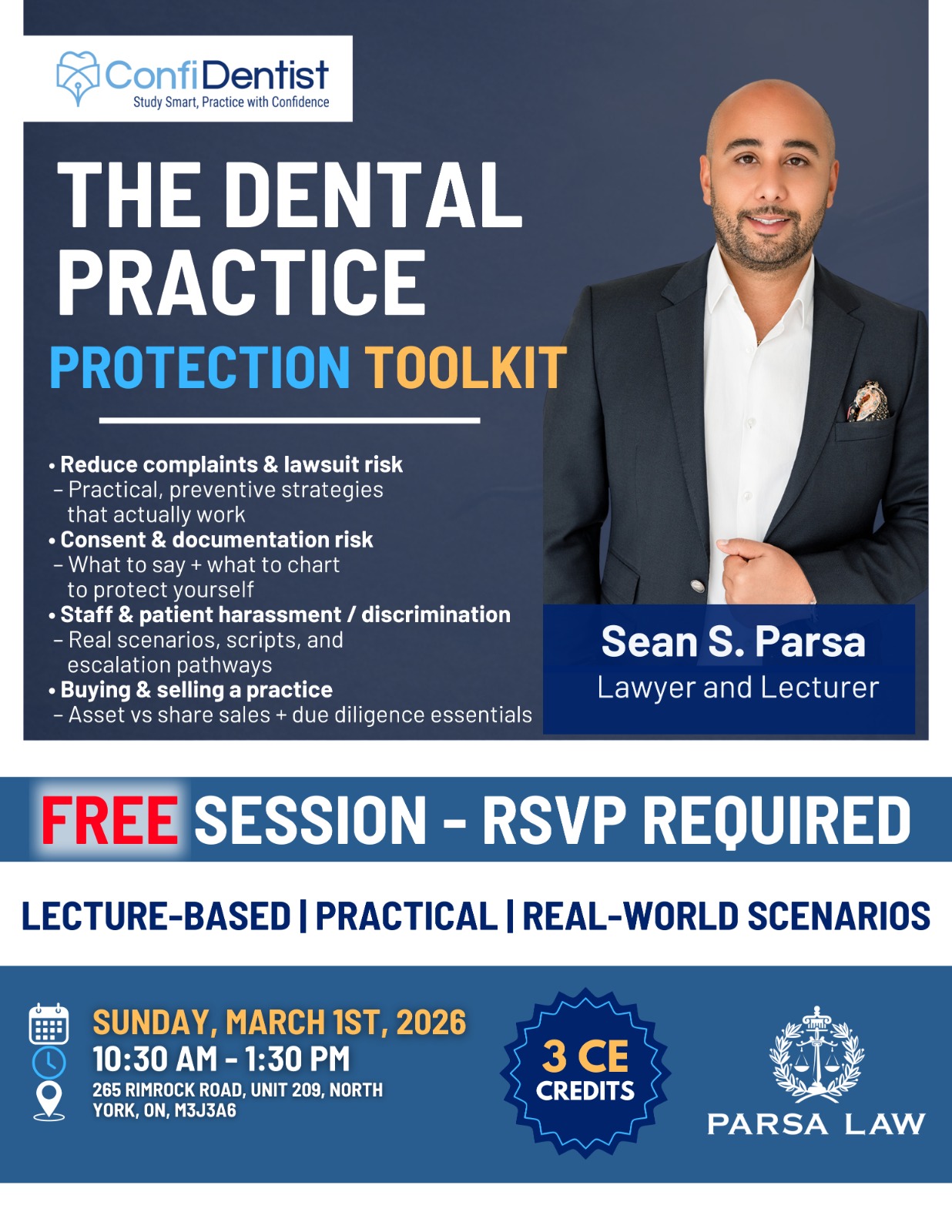 Parsa Law — lawyer-led session focused on practical risk management for dental clinics in Ontario.